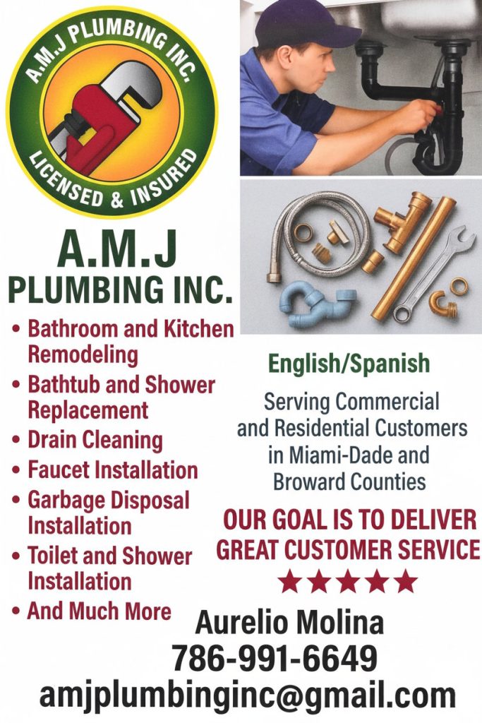 AMJ Plumbing Inc. proudly serves homeowners and businesses throughout Broward County and Dade County, providing dependable scheduling, swift dispatching, and transparent updates from appointment to completion.